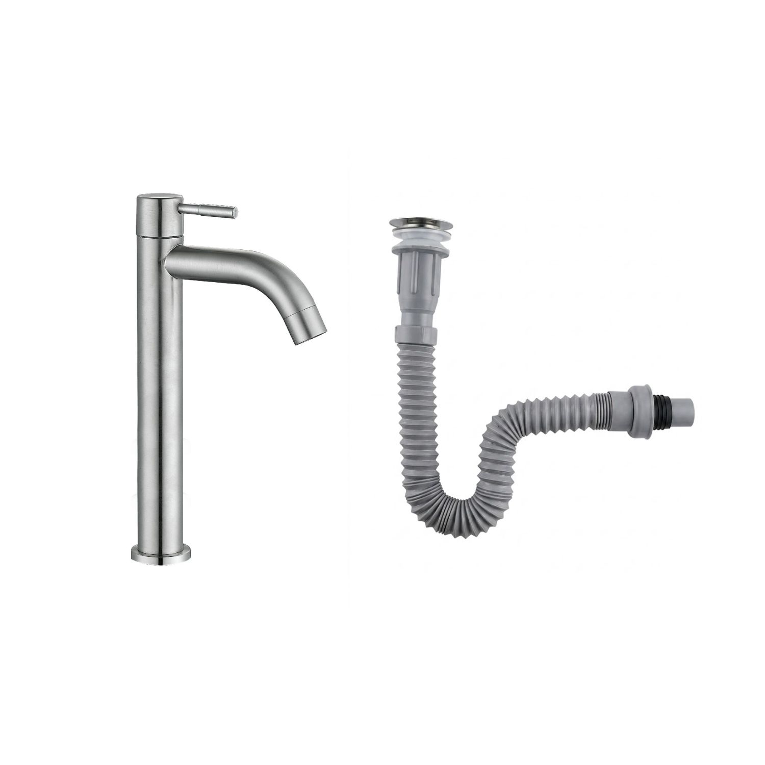 Combo Grifería Alta Agua Fría+ Desagüe Flexible Satinado